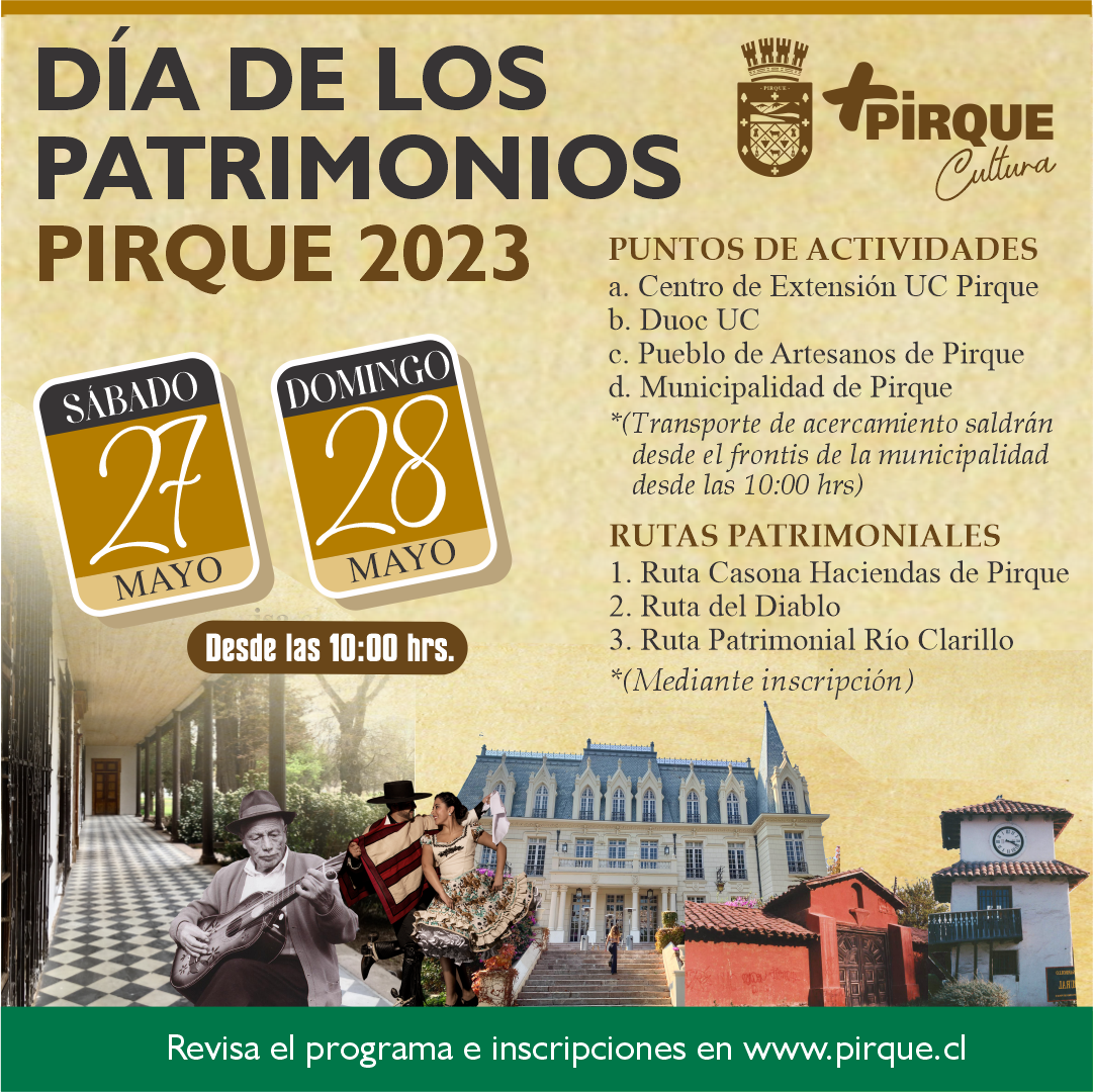 Para más información y el detalle de todo el programa de actividades y rutas puedes visitar www.pirque.cl/dia-del-patrimonio
